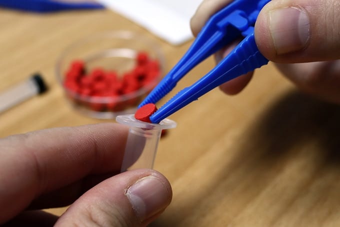 - Si le patient présente une anomalie du système immunitaire, il faut logiquement lui faire passer un test sanguin. On regarde alors le dos de la première carte Diagnostic Bilan sanguin, qui présente un schéma à reproduire avec les jetons rouges et blancs de la tuile Examen sanguin, à ne manipuler bien sûr qu’avec des pincettes (ce serait trop facile sinon).