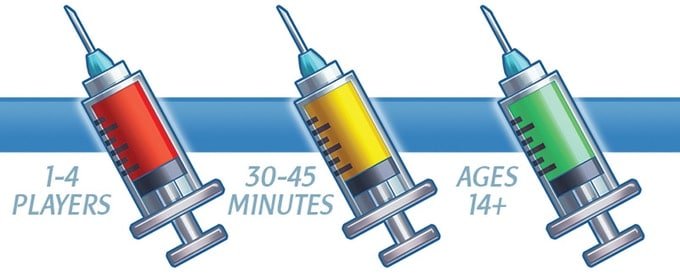 David Turczi est cette fois accompagné par Konstantinos Kokkinis et Anthony Howgego (auteur du curieux Sarah’s Vision), pour un jeu développé par Vangelis Bagiartakis (Freedom!, La Quête du Bonheur, Dice City) et illustré par Gong Studios (Aeon’s End, Les Petites Bourgades, Smash Up, Charterstone). Vendu 50 euros (un prix qui se justifie parfaitement vu le matériel, comme vous le verrez !), il se joue de 1 à 4 médecins (avec plus de contrôle à 2 et plus de chaos à 4) de 10/12 ans et plus, à condition de n’avoir aucune répulsion pour le thème de la maladie ou les piqûres, pour des parties d’environ 30 minutes, mise en place comprise.