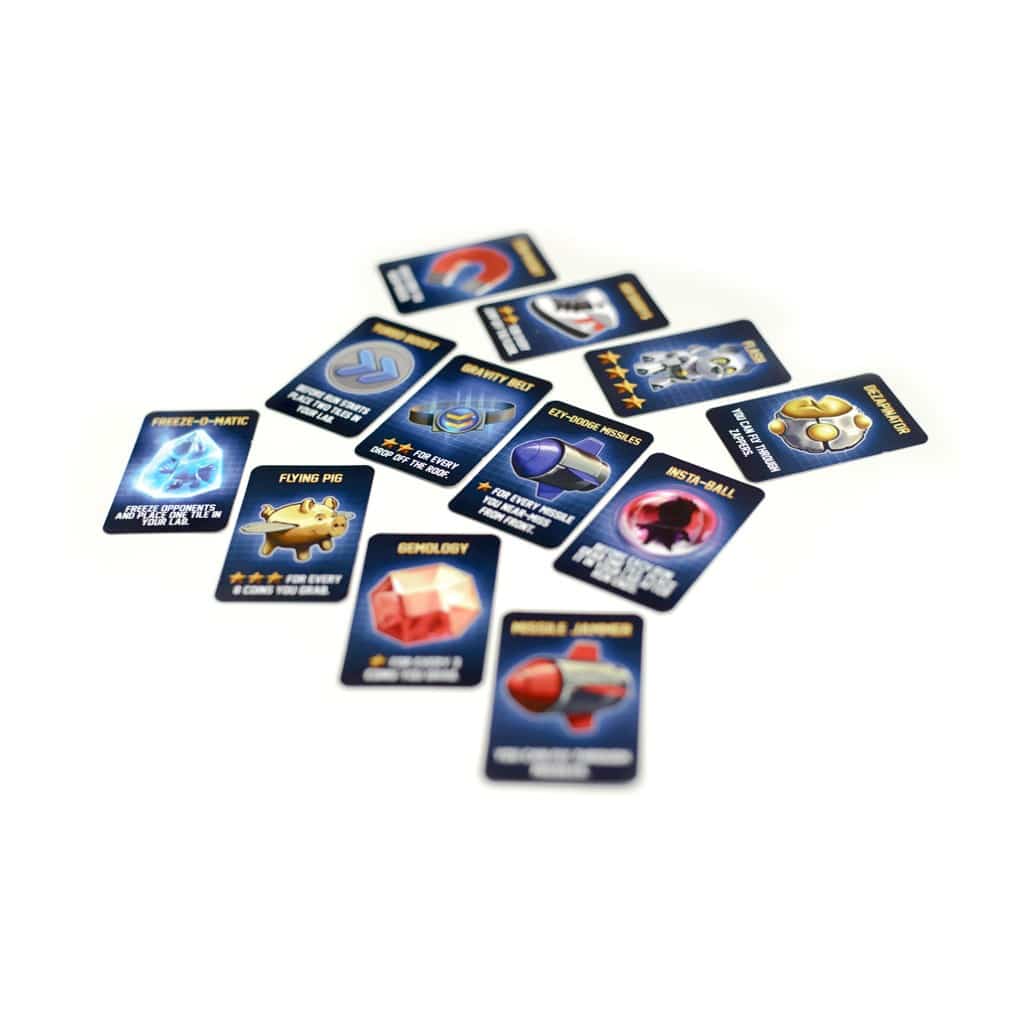 On dévoile alors aléatoirement autant de cartes Gadget que de joueurs, et en commençant avec celui qui a totalisé cette manche-ci le score le plus bas, chacun en prend une, qui lui donnera un pouvoir permanent jusqu’à la fin de la partie. Il peut s’agir de gagner 1 PV par lot de 3 pièces, ou 1 PV par missile frôlé par la tête, ou 4 PV à la fin de chaque manche, de poser deux tuiles de son choix avant le début de la manche, de collecter les pièces que l’on frôle (avec l’aimant, bien sûr), de pouvoir couvrir les missiles ou les zappeurs sans pénalité, de crier « Gel » une fois par manche pour paralyser tous ses adversaires pendant 10 secondes ou le temps de poser une tuile…