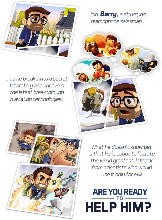 Dans l’application très populaire développée par Halfbrick en 2011, il s’agissait de guider Barry Steakfries vers la sortie d’un laboratoire top-secret dont il a dérobé un jetpack. On y dirigeait donc un avatar devant prendre ou perdre de l’altitude pour éviter des obstacles, mais aussi récupérer des pièces et divers bonus facilitant sa progression, et remplir des objectifs afin de monter en niveau.