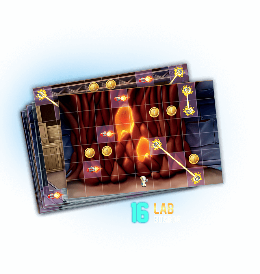 Que serait Jetpack Joyride sans son laboratoire ? Chaque joueur commence logiquement en prenant un set de 4 grandes cartes Secteur numérotées 1 à 4, parmi les 24 cartes disponibles (16 de difficulté normale, 8 difficiles, panachables). Il les juxtapose devant soi pour former le parcours de son Barry.