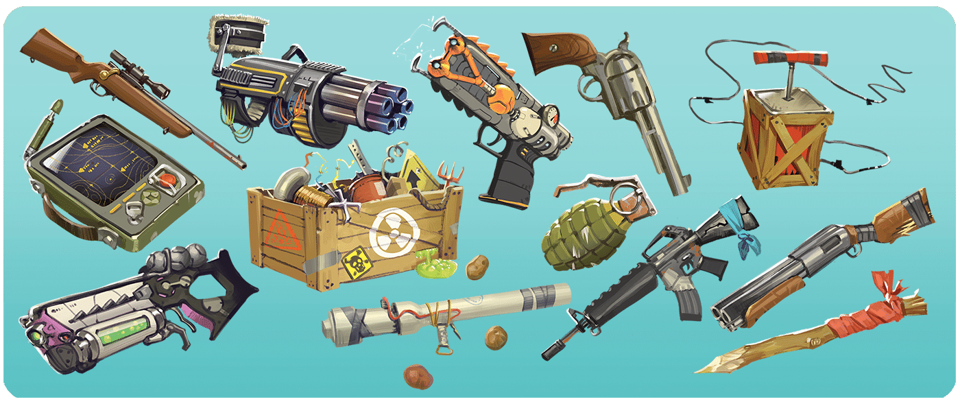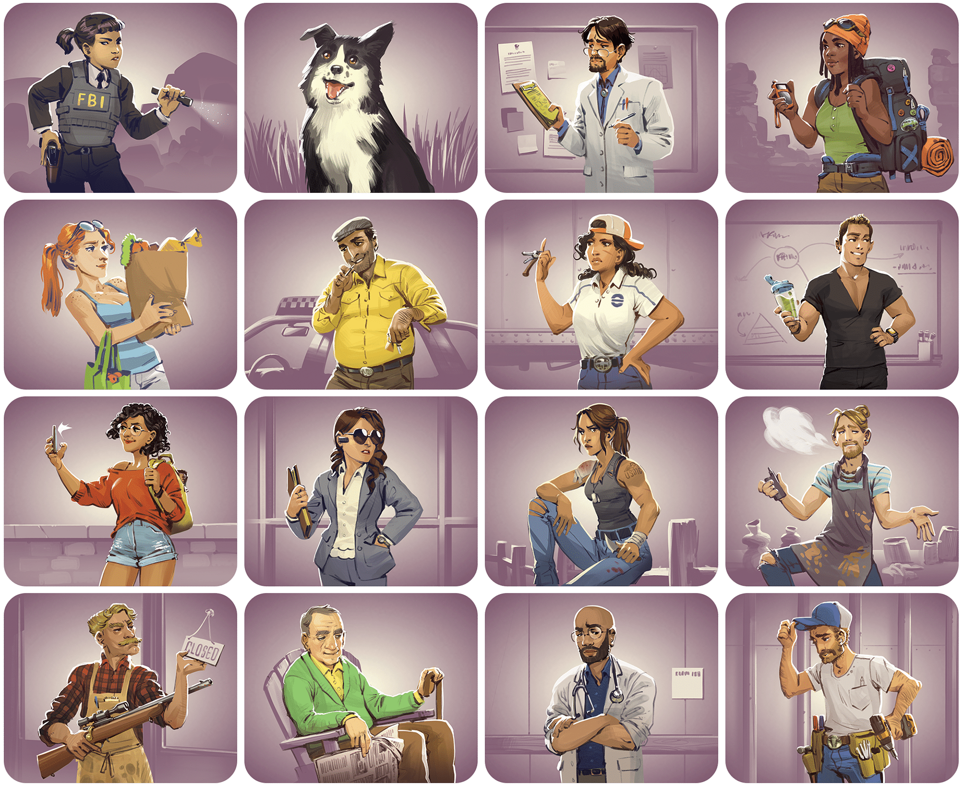 Chaque joueur reçoit un pion (une petite voiture en bois), un objet et une arme gardées secrètement devant lui, une main de 3 véhicules, et enfin 3 cartes Personnage, posés en pile face visible, avec le personnage choisi comme Leader au-dessus – c’est le seul dont le pouvoir s’applique, d’où l’intérêt de bien le désigner, quitte à le laisser mourir en cours de partie s’il ne s’avère plus si intéressant.