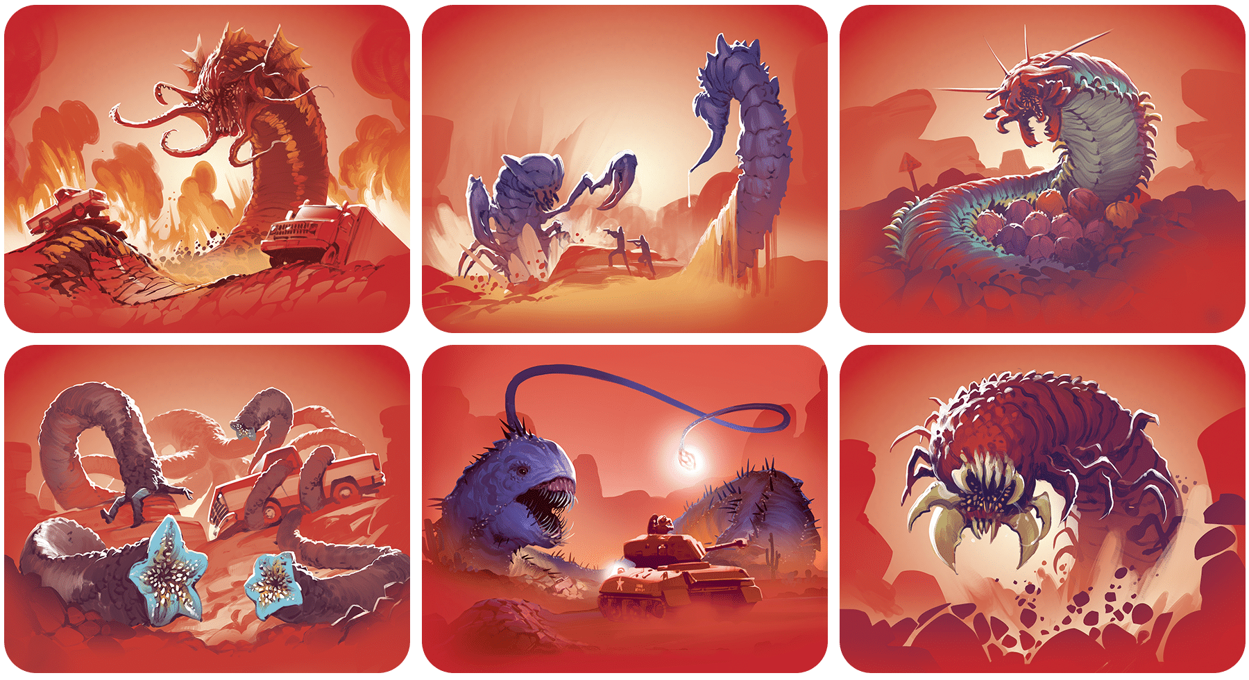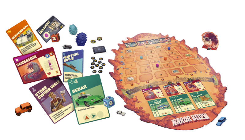 Terror Below a de quoi se faire remarquer. À n’en regarder que les mécaniques, il ressemble à un ameritrash somme toute assez classique, avec du déplacement et de l’activation de nombreux types de cartes aux innombrables pouvoirs particuliers, pour un thème non moins typique d’un ameritrash, de la collecte d’œufs mutants et du massacre de gros vers. Naturellement on apprécie d’emblée la cohérence entre thème et mécaniques, des attaques imprévisibles et massives de V.E.R. devant agréablement être traduites dans un relatif chaos du système de jeu, propice à un déchaînement franchement fun d’actions…