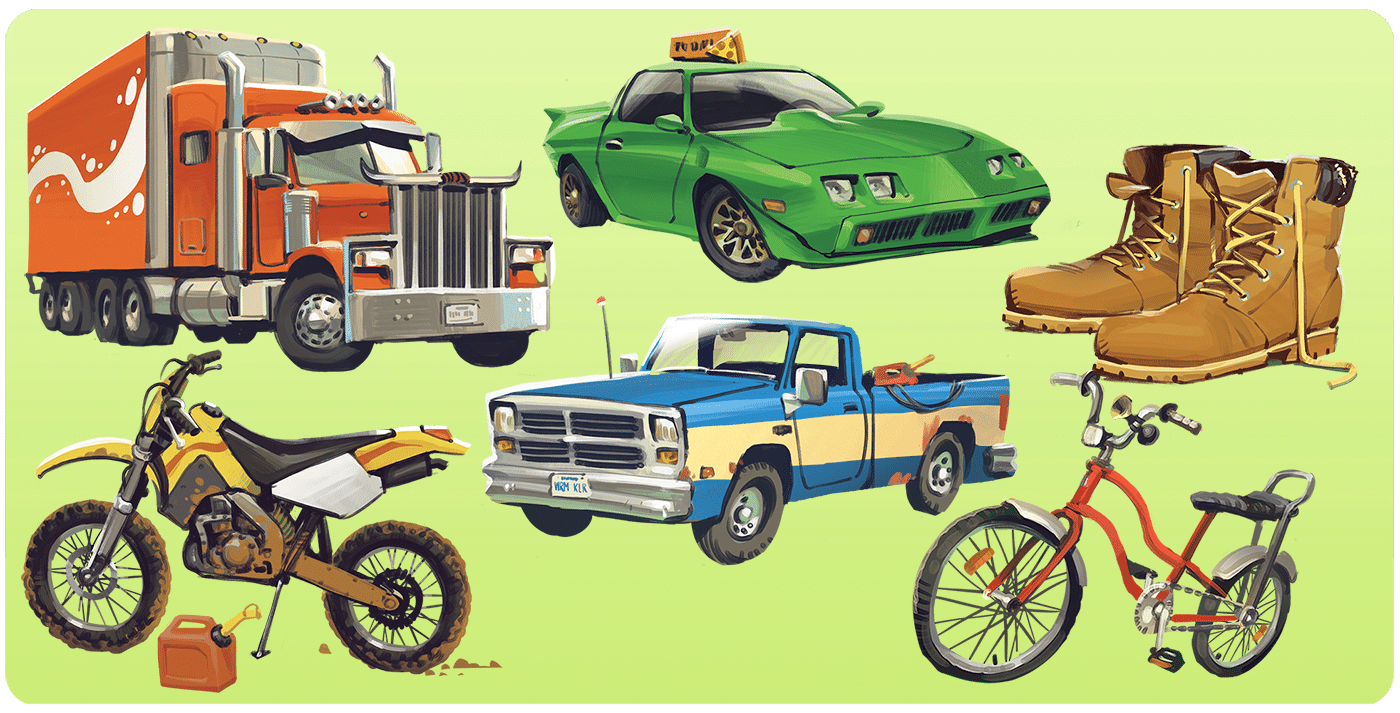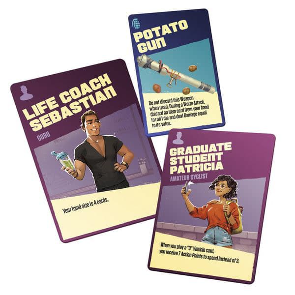 Enfin, la carte Véhicule est dotée d’une capacité spéciale obligatoire, positive ou négative. Les Bottes permettent par exemple de jouer une autre véhicule de sa main, mais seulement pour son bonus de PA (les bottes elles-mêmes n’en valent que 2) ; la Moto (qui vaut 6 PA) rapproche toutes les cibles d’une case vers soi…