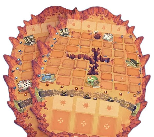 Sur le plateau, 5 cases du carré de 6 par 6 portent un crâne de taureau pour signifier que l’on doit y placer une tuile Lieu. Avec un peu d’habitude, on pourra les placer tout à fait aléatoirement au moyen des dés (indiquant pour l’un une abscisse et pour l’autre une ordonnée) ! Près du Bâtiment officiel, la pile de cartes Prime, dont les quatre premières sont révélées dans la ligne des primes, au sommet du plateau ; près de la Police d’État, la pile de cartes Arme ; près du Magasin général, la pile de cartes Objet.