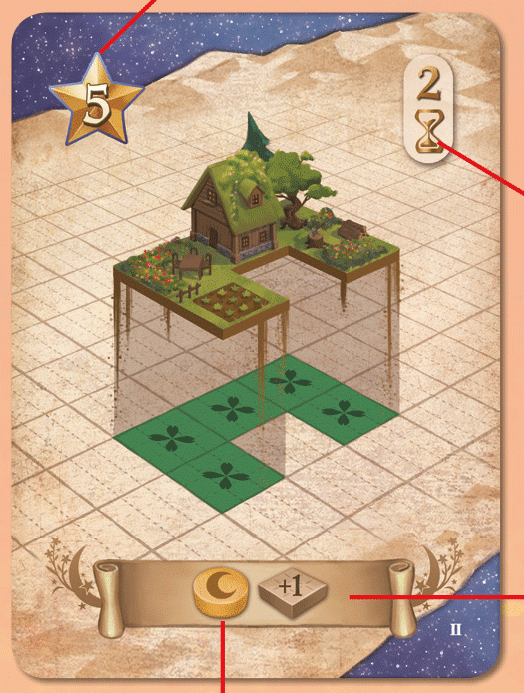 En plus de ces actions, on peut construire des bâtiments autant de fois qu’on le souhaite, avant ou après, tant que c’est possible. Pour cela, il faut que ses fragments et esprits reproduisent exactement le schéma de l’une des cartes Bâtiment face visible. Les fragments sont alors défaussés, les esprits récupérés par le joueur, et la carte récupérée, représentant diverses caractéristiques :