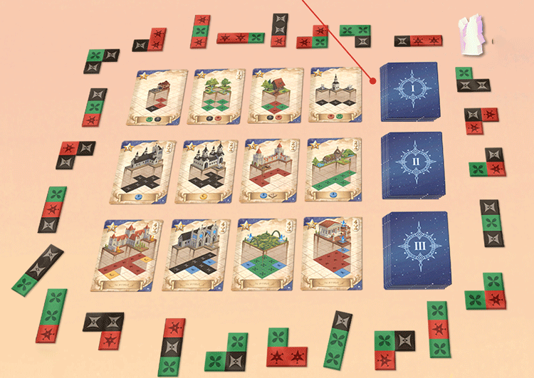 Prévoyez une grande table pour Le Royaume des sables : sur une large portion, on divise les 54 cartes Bâtiment en trois piles, une par niveau, pour en dévoiler quatre de chaque. Elles évoquent assez immanquablement celles d’Unearth par leur dessin très géométrique, et on trouvera assurément très joli la superposition des bâtiments et de cases de couleur représentant les matériaux pour les construire, avec une cohérence entre les uns et les autres. On les entoure des 28 tuiles runiques (des polyomino à trois cases – triominos ?), disposées aléatoirement en cercle. Le meeple Reine est placé au hasard entre deux de ces tuiles.