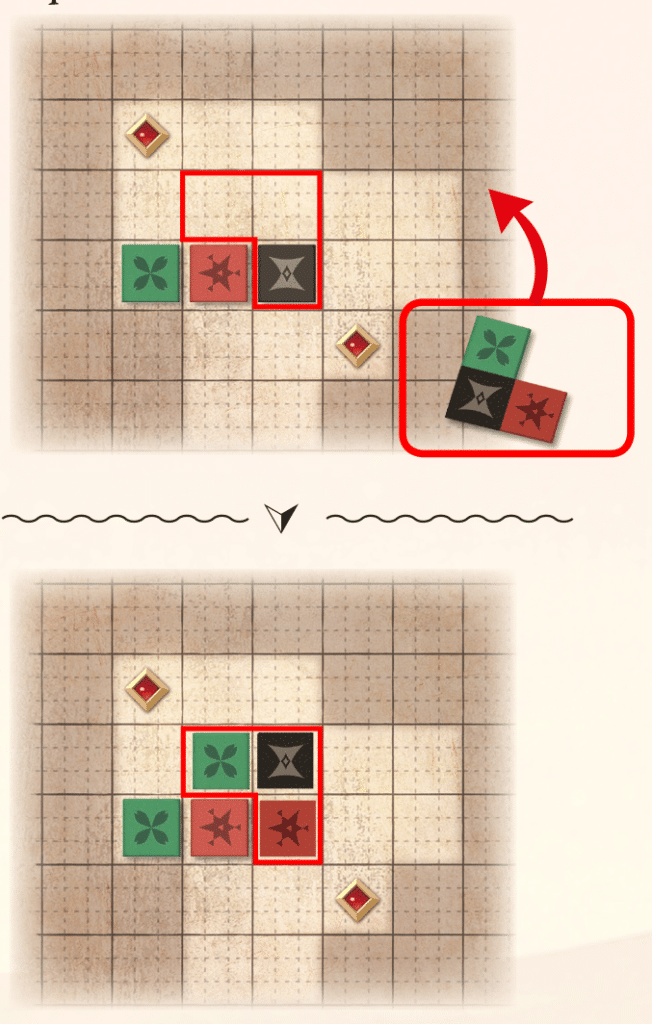 La première action est le placement de fragments runiques : le joueur prend l’une des trois tuiles devant lui et la pose sur sa zone de manipulation (la zone blanche de son plateau personnel). Puis il la remplace par des fragments runiques correspondants (mêmes couleurs, rouge, noir ou vert, composant la même forme, tandis que la tuile est placée à la fin du cercle runique (juste derrière la reine). Il récupère enfin l’une des deux tuiles devant elle au choix, afin d’en avoir toujours trois devant lui.