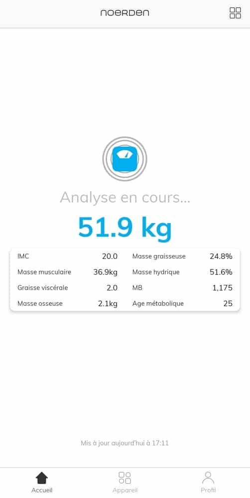 Puisqu’il s’agit d’une balance connectée, il est intéressant d’installer l’application NOERDEN pour profiter de toutes les possibilités qu’offre cette balance. Depuis cette dernière vous pourrez enregistrer les différentes prises de poids et accéder à toutes les mesures qu’offre cette balance. Comme vous avez pu le comprendre peut-être si vous avez déjà lu l’article sur la montre NOERDEN LIFE2+, j’avais déjà installé l’application concernée. De là, une petite connexion Bluetooth pour détecter la MINIMI et le tour est joué !