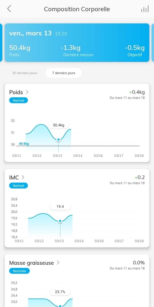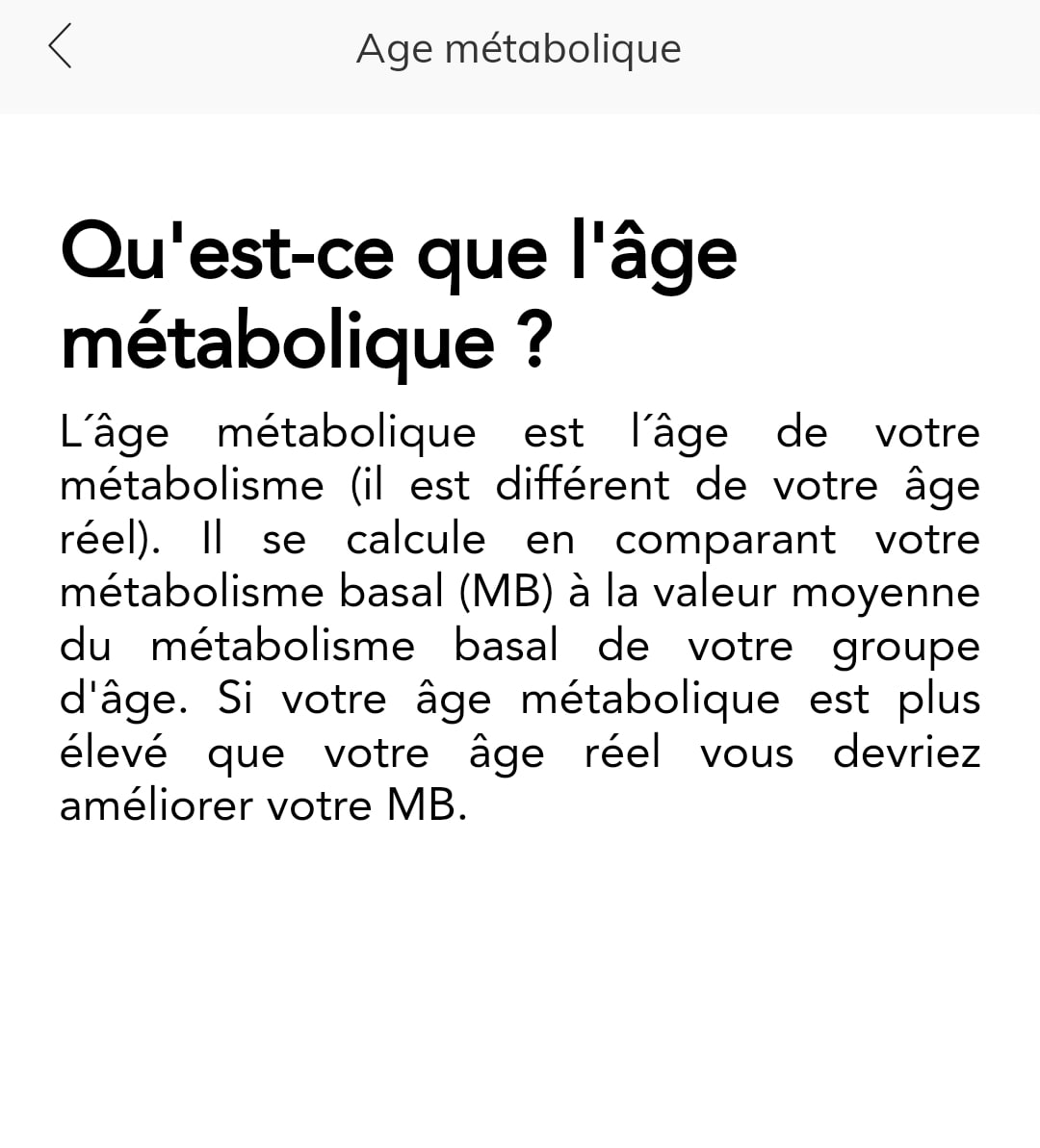 Depuis l’analyse, vous pouvez accéder à votre historique ainsi qu’à toutes les mesures différentes, en choisissant un jour en particulier. De plus, en cliquant sur chaque mesure, vous pourrez lire un descriptif de chaque mesure, si elle ne vous semblait pas assez claire.
