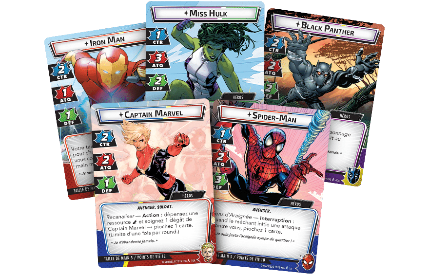 - Sur sa face Alter ego, le héros possède une valeur de récupération (3 pour l’homme-araignée, 4 pour Captain Marvel). En l’inclinant, il se soigne d’autant de points de vie.