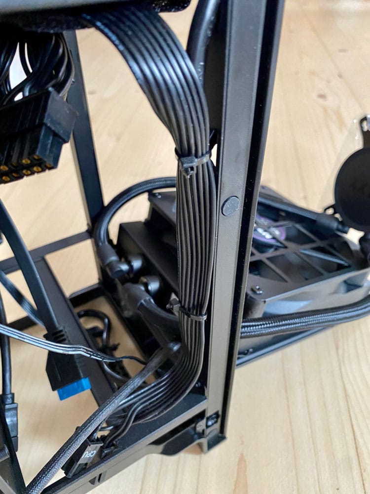 Premier point, le manuel est dans une boîte qui se trouve au centre du H1. Et celui-ci vous explique comment ouvrir proprement ce dernier. Wait what !? Dommage de ne pas avoir mis le manuel dans le carton, ça éviterait de mauvaise manip. Autre désagrément, la façade en verre trempé a un autocollant papier… une hérésie en 2020, un coup de WD40 ou d’alcool fera l’affaire. Cependant, on peut ouvrir le châssis intégralement sans outil, ce qui est appréciable pour aller nettoyer les filtres. Une fois les deux vis du watercooling enlevés, l’accès à la partie carte mère est d’une facilité déconcertante. Les connecteurs sont déjà en place et il ne nous reste plus qu’à les insérer dans la carte mère.