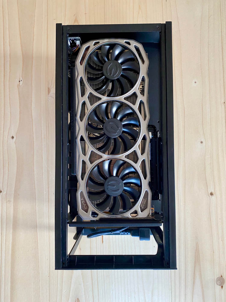 Coté carte graphique, j’ai voulu prendre la plus grosse que j’avais sous la main. On est donc parti sur une EVGA 1080Ti FTW3. Sur le papier, elle était un peu très grande pour le boitier, mais en réalité elle passe pile poil si on démonte l’IO du dessus pour la mettre en place. Oui, dans mon cas, la carte graphique fait la taille du boitier et j’adore.