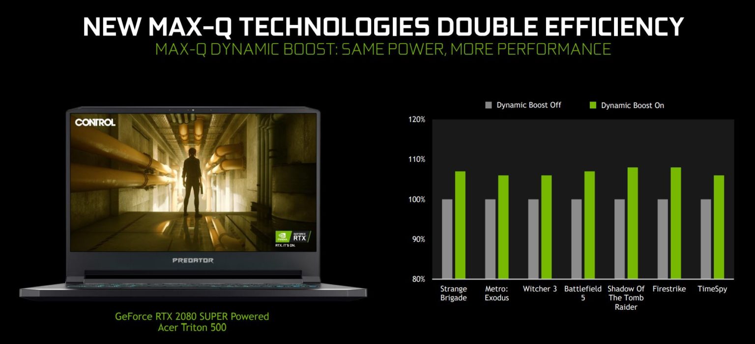 Nvidia a aussi dévoilé une fonctionnalité portant le nom de Dynamic Boost. Cela consisterait en un équilibre dynamique et adaptatif entre le CPU et le GPU. Ces derniers devraient aussi supporter le Advanced Optimus qui lui serait une amélioration du changement d’affichage sur ordinateur portable entre le GPU ou la partie graphique intégrée au CPU afin de conserver la batterie suivant l’utilisation de l’appareil.