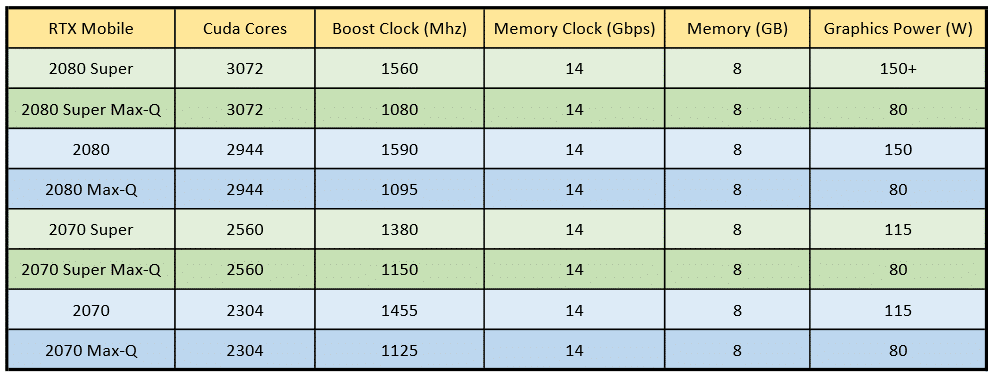 On remarquera que Nvdia n’a pas dévoilé pour le moment de RTX 2060 Super et RTX 2060 Super Max-Q. Elles seront surement annoncées plus tard, car on les retrouve sur les fiches techniques de certains constructeurs. Comparons maintenant ces nouvelles versions Super et Super Max-Q.