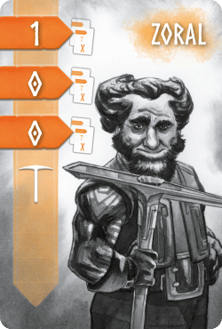 - les nain.e.s oranges sont des mineur.euse.s : ils/elles rapporteront autant de PB que la somme de leur valeur multipliée par leur nombre de grades. Pour compenser cet effet extraordinairement puissant, la plupart de ces cartes ont une valeur… de 0, tandis qu’on se battra pour chaque mineur.euse arborant 1 seul point !