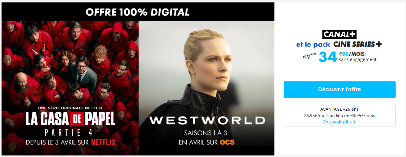 Le jour de la sortie française de Disney+, je me suis abonné au pack CineSeries+ de Canal+. Pour 34,90 € (au lieu de 49,90 € normalement) par mois sans engagement, j’ai ainsi accès aux séries et surtout à l’exceptionnel catalogue de films de Canal+, mais aussi à OCS, Netflix et donc Disney+ ; profitons-en pour rappeler qu’en ayant moins de 26 ans, ce pack vous coûtera 39,95 €, et en ce moment 26,95 € !