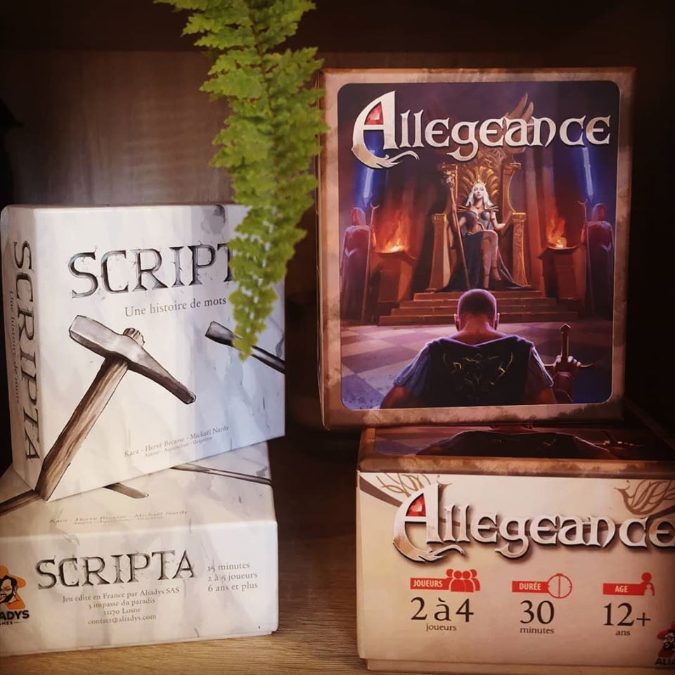 Il y a quelques jours, je présentais le chouette jeu de lettres et d’ambiance Scripta, croisement réussi entre UNO et Scrabble, premier jeu des voisins costaloriens d’Aliadys, ce qui avait naturellement attisé ma curiosité pour leur deuxième (et seul autre à ce jour) oeuvre, Allégeance. Il m’avait à vrai dire déjà intrigué en septembre, au festival Ludimania de Saint-Apollinaire (dans le Dijonnais), où j’avais découvert qu’il était illustré par Miguel Coimbra.