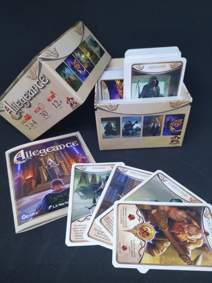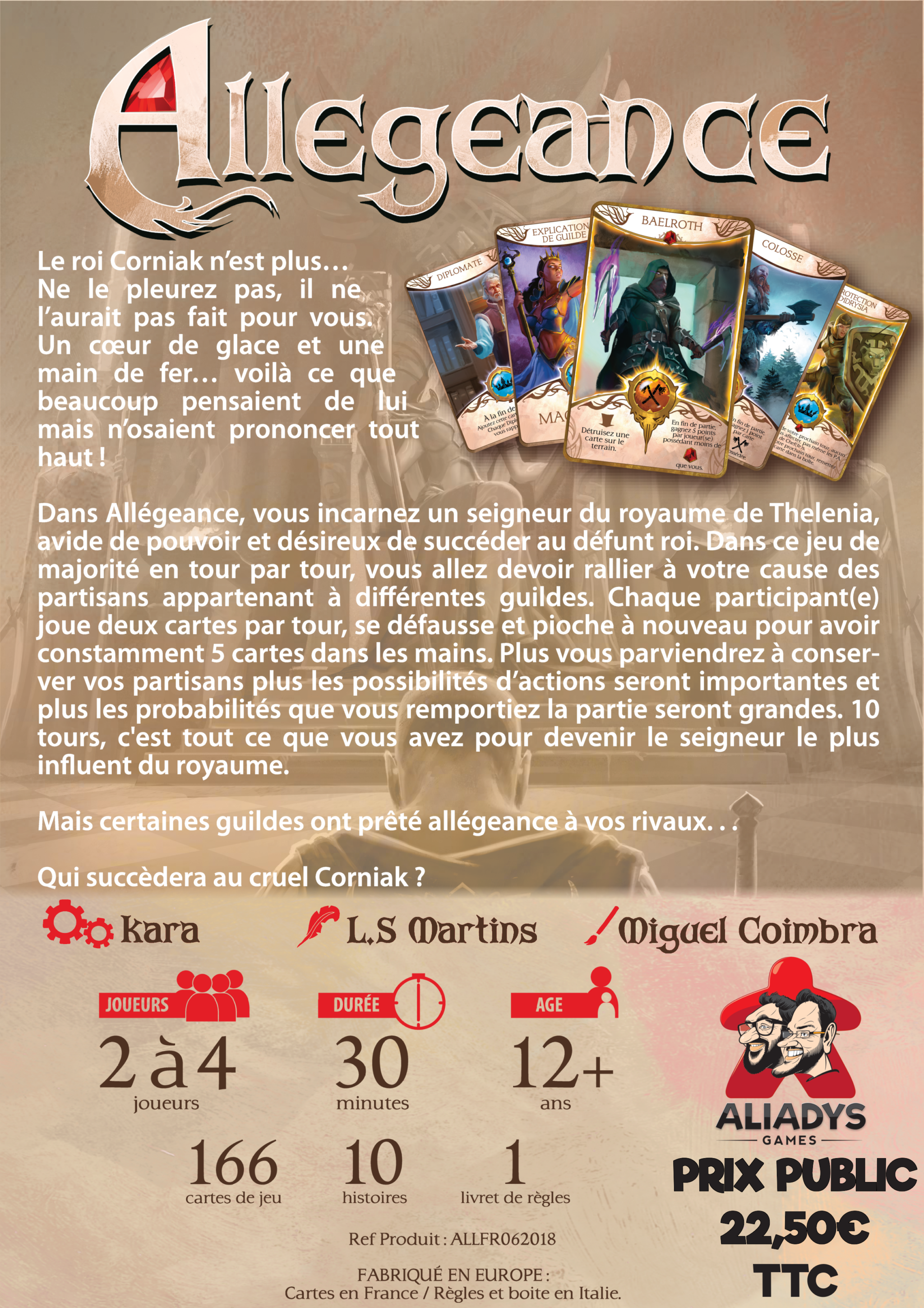 Conçu comme Scripta par Kara, Allégeance fait en outre appel à l’écrivaine L.S. Martins pour imaginer son background, à travers un synopsis et 11 cartes présentant les 10 guildes en simulant des documents de genres différents (lettre, conversation, essai, carte…), afin de nous faire pénétrer littérairement et de façon vivante dans le royaume de Thelenia, orphelin de son sanglant suzerain, et en proie à une lutte de pouvoir pour lui succéder. Ainsi les 2 à 4 joueurs de 10 ans et plus incarneront-ils des seigneurs tâchant de se gagner les faveurs de dix guildes afin de s’asseoir durablement sur le trône.