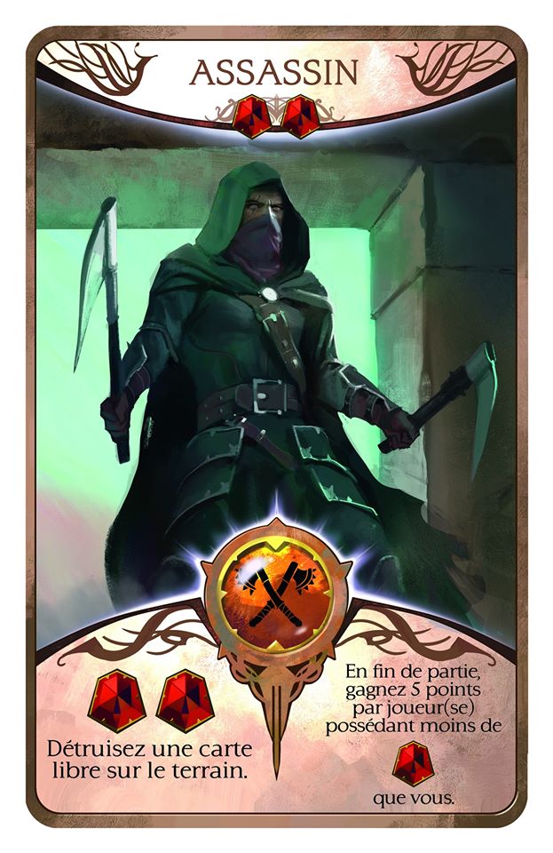 - les assassins détruisent la carte supérieure d’une guilde, adverse ou non d’ailleurs, contre 2 gemmes.