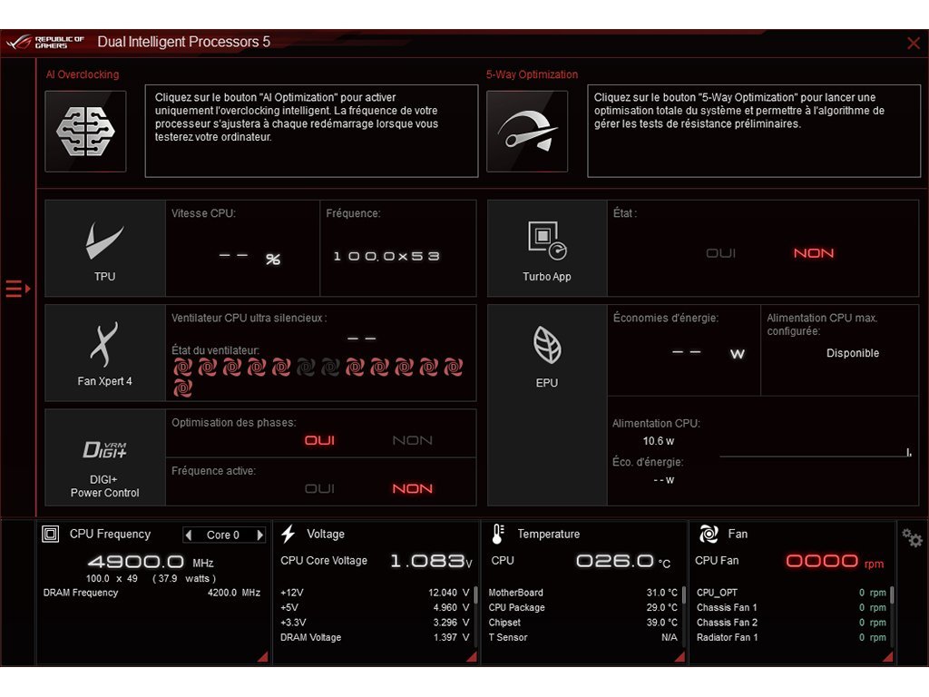Les nouveaux paramètres seront ainsi directement appliqués et vous obtiendrez un rapport des changements opérés sur les différents cœurs. Réalisant mes tests sur une benchtable, je n’ai pas pu tester intelligence artificielle pour les ventilateurs, mais sachez que AI FAN est aussi disponible.