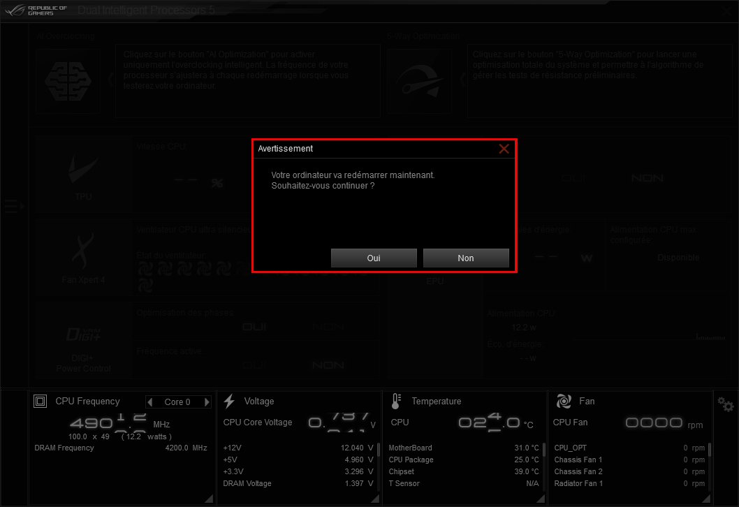 La manipulation décrite ci-dessus peut également se faire via le logiciel AI Suite III. Pour ce faire, il faudra préalablement installer le logiciel et le mettre à jour. Ensuite cliquer sur l’encadré ci-dessous et accepter le redémarrage de votre configuration.