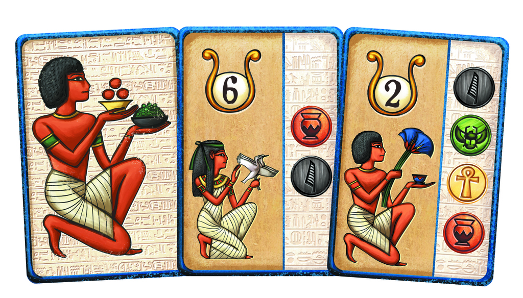 On ajoute aux objectifs des dieux les points des nobles, des artisans, de la chambre funéraire, des pistes du Nil, 1 PP par jeton Ressource ou Offrande, les PP des jetons Offrande, 7 PP pour le Pharaon et 3 PP pour celui qui possède le jeton Premier joueur – ce qui signifie que même à la cinquième manche il peut être intéressant de passer assez tôt !
