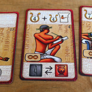 Juste assez technique pour ne pas donner l’impression de jouer à un sous-Pharaon, et pourtant assez simple pour ne pas imposer de fastidieux retour aux règles. On appréciera en outre que certains puissent jouer avec les scribes et d’autres avec les nobles « normaux », toutes ces cartes étant pensées pour s’équilibrer !
