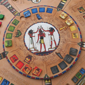 Le principal atout matériel (et même en grande partie mécanique) de Pharaon, c’est sa tablette des Dieux, un disque monumental composé de cinq parties emboîtées aléatoirement, au centre desquelles on place la roue des actions. En alignant bien les colonnes, on s’assure ainsi de faire correspondre actions et quartiers, garantissant un peu d’aléa prometteur de rejouabilité, et surtout une certaine magie dans la rotation d’un pièce aussi grande et belle.