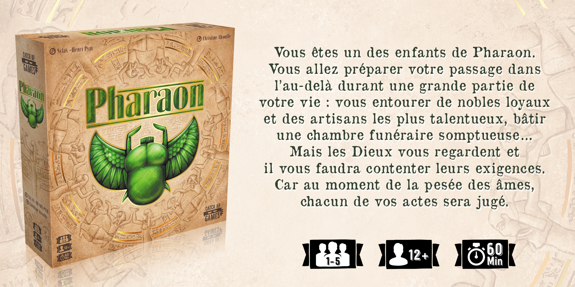 Conçu par Sylvain Lasjuilliarias dit Sylas (Samsara) et Henri Molliné dit Pym (Monster Slaughter), superbement illustré par la décidément incontournable Christine Alcouffe (Baron VoodooYokaiPaper Tales), Pharaon s’adresse ainsi à 1 à 5 Égyptiens antiques de 12 ans et plus pour des parties d’une heure, et est vendu 36 euros.