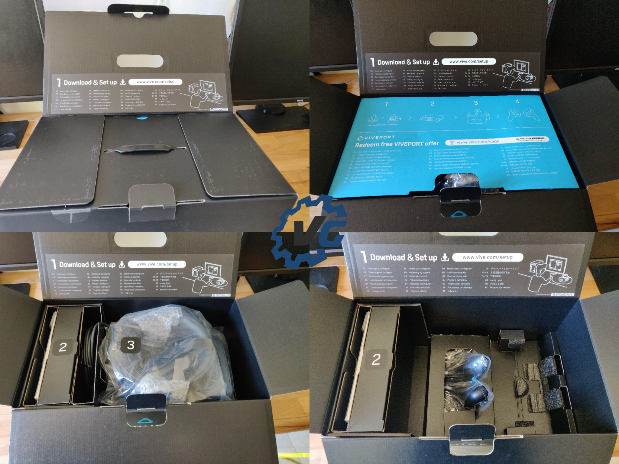 Une fois ouverte, la boîte nous invite à télécharger et à installer le casque en suivant les recommandations sur vive.com.setup, le tout en 27 langues différentes. Vous retrouverez également le code pour l’abonnement à la plateforme, sans oublier les 4 schémas vous indiquant quelles sont les pièces maîtresses que vous retrouverez dans la boîte. En effet, à l’intérieur nous retrouvons donc :