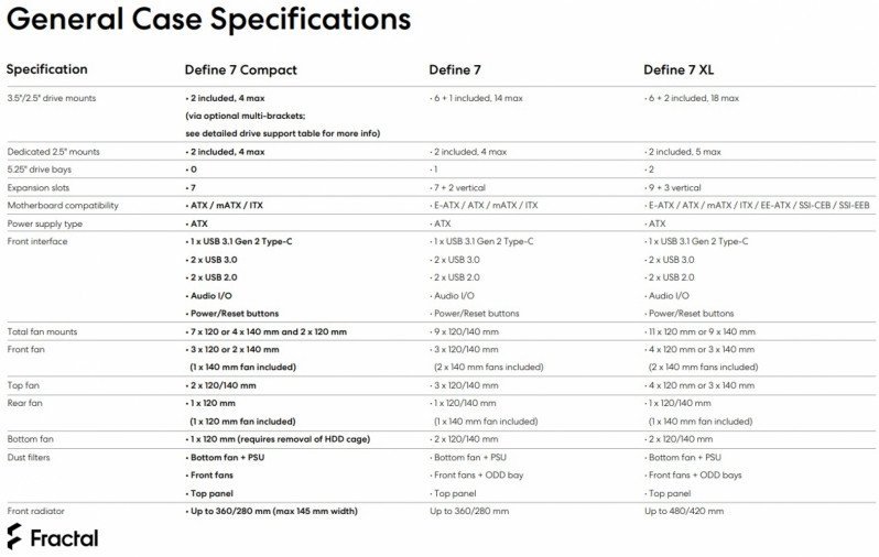 On garde donc la très bonne qualité d’ensemble et des fonctionnalités similaires dans la limite du possible. Le but de Fractal est de proposer à chacun le boitier qui lui correspond. Ainsi, si le Define 7 vous intéresse, mais que vous ne comptez pas installer une carte mère « E-ATX », énormément de disques, une très longue carte graphique ou une configuration particulière de radiateurs, alors vous serrez ravis de la sortie de ce nouveau modèle. Vous retrouverez plus de précisions sur les spécifications des différents boîtiers de la série sur le tableau suivant :