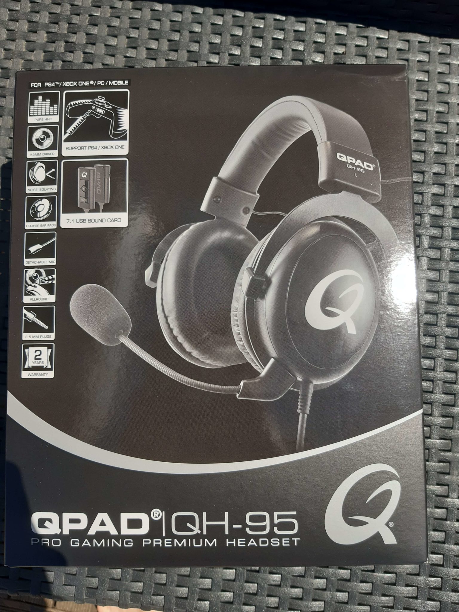 Présentant une boîte sobre, le casque QPAD QH-95 fait en sorte de rapidement présenter toutes ses caractéristiques et accessoires. Sur la face avant, on trouve une présentation du casque ainsi que quelques-unes des propriétés que ce dernier offre. Les deux informations qui sautent directement aux yeux sont sa compatibilité avec la PS4 et la Xbox One (afin d’affirmer son statut de casque de gaming) et la carte son USB externe lui permettant de se différencier de son petit frère (et de justifier ainsi ses 10 euros supplémentaires).