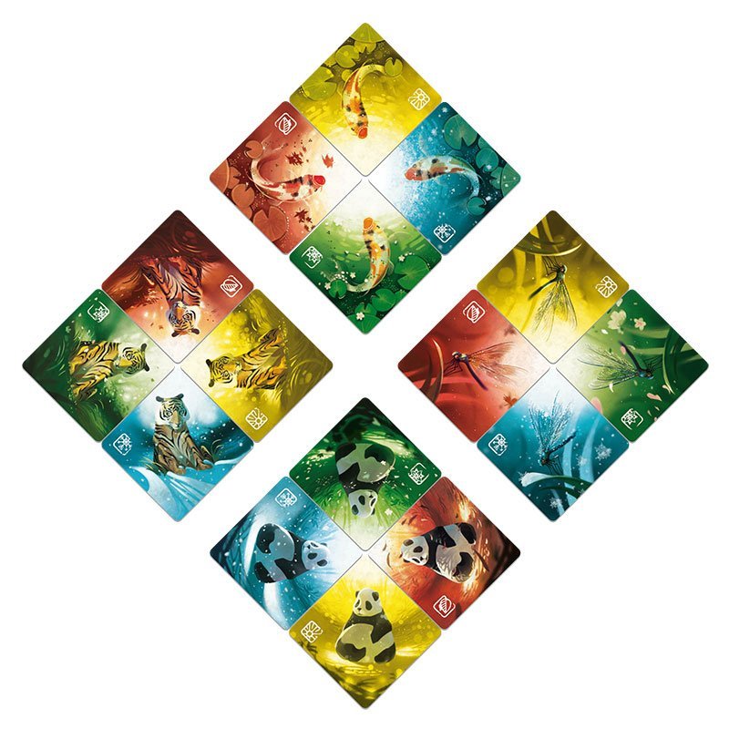 Une carte représente toujours un animal (le tigre, le panda, la libellule ou la carpe) dans une saison (printemps, été, automne, hiver), chaque combinaison existant deux fois.
