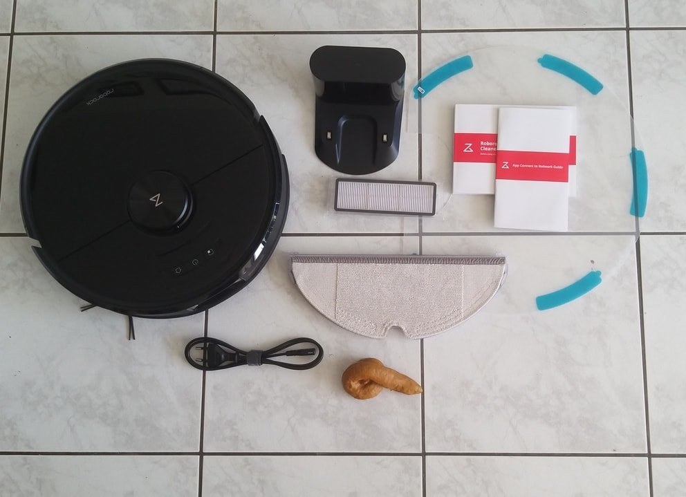 L’ouverture est simple et on découvre un colis compartimenté qui nous présente l’aspirateur et ses différents éléments. On liste le Roborock S6 MaxV, la station de chargement, le tapis imperméable et son câble d’alimentation, un filtre, les manuels d’utilisateur et d’entretien, un support de serpillière, une serpillière et une crotte en plastique (sûrement destinée à tester le détecteur de déchets animaux).