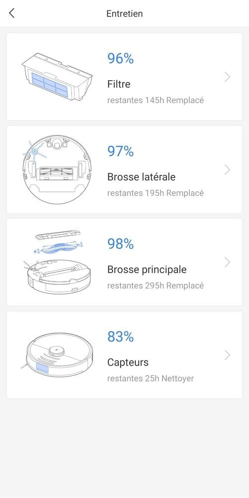 Bien entendu, un tel appareil implique d’en prendre soin. Comme nous l’évoquions plus haut, l’onglet Entretien est déjà d’une grande aide (même si j’ai reçu à quelques reprises une notification concernant la brosse latérale à changer alors qu’il lui reste plus d’une centaine d’heures de vie. Possible que quelques cheveux s’y glissent et perturbent le capteur ?). Il nous permet d’anticiper le nettoyage ou le remplacement des différents éléments de l’aspirateur : la brosse latérale, la brosse principale, les filtres ou encore les capteurs à nettoyer. Il faut bien sûr compter dans le budget le remplacement des pièces donc, mais en moyenne, chaque élément a environ 200 heures de vie devant lui, de quoi nous rassurer !