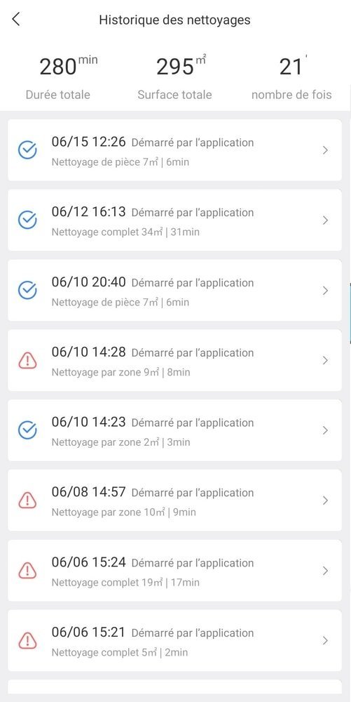 L’application vous envoie par ailleurs quelques notifications lors du passage de votre robot si celui-ci se retrouve coincé ou qu’il rencontre un problème. Très pratique ! Et même si l’on se trouve loin de son appareil, on peut tout simplement le couper à distance, et l’empêcher d’insister dans son ménage s’il est gêné.