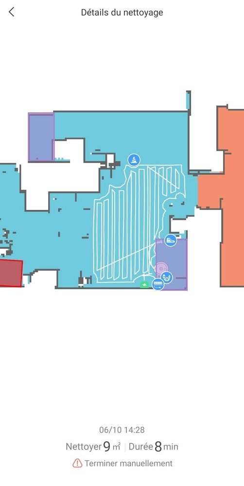 J’ai été très impressionnée par cette partie. On découvre le chemin que parcourt notre robot (en temps réel !) et on comprend rapidement qu’il délimite d’abord une zone en en faisant le contour avant de nettoyer par allers-retours l’intérieur de cette zone, avant de passer à une autre zone jusqu’à ce qu’il ait parcouru tout l’appartement. Alors, on peut accéder à notre carte de l’appartement, afin de procéder à quelques ajustements par pièce. Grâce à l’application, vous pouvez fusionner/diviser des zones afin d’en faire des pièces, ce qui rendra votre nettoyage plus simple : peut-être ne souhaitez-vous nettoyer que la cuisine certains jours, ou bien les chambres ? Cela est possible ! De même, on vous propose de délimiter quelques zones interdites d’accès pour l’aspirateur (en rouge) ou bien interdites au passage de serpillière (en violet). De notre côté, nous avons décidé d’éviter la zone où se trouve l’étendoir puisque l’aspirateur tentait de passer par dessus, et de ne pas nettoyer où se trouvent les ordinateurs et la litière du chat (nous préférons faire ces zones nous-mêmes).
