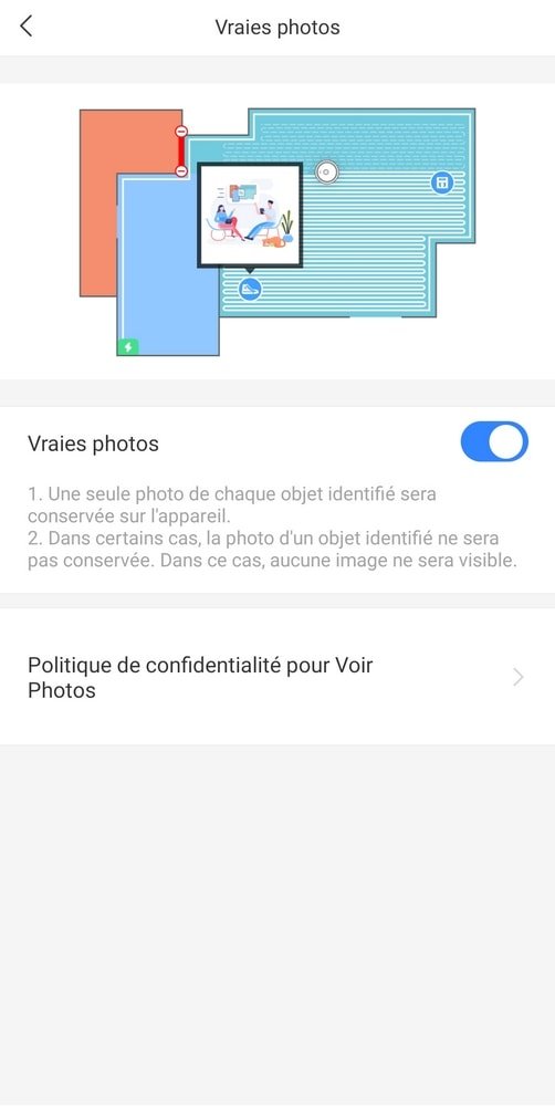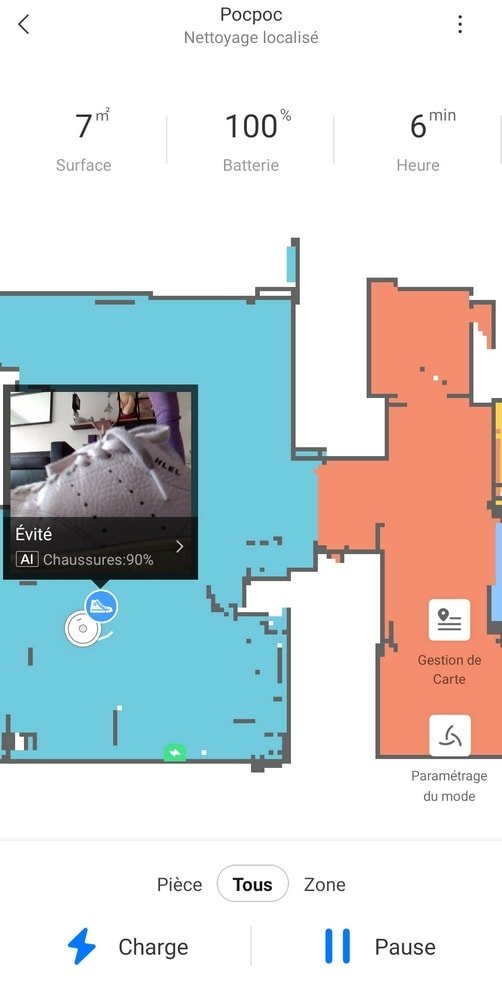 Et ce n’est pas tout ! Une petite nouveauté a fait son apparition au cours de mon test : à présent, grâce à une option à cocher dans vos paramètres Fonctions de la caméra : Vraies photos, votre aspirateur robot pourra prendre en photo l’élément identifié. Ainsi, une fois le nettoyage effectué, vous pourrez cliquer sur le petit icône qui apparaît et vous verrez une photo de l’obstacle (prise depuis le robot bien sûr, donc l’angle n’est pas toujours le plus adéquat). Vous pourrez même préciser si ce n’est pas du tout la bonne identification et aider le robot aspirateur à s’améliorer !