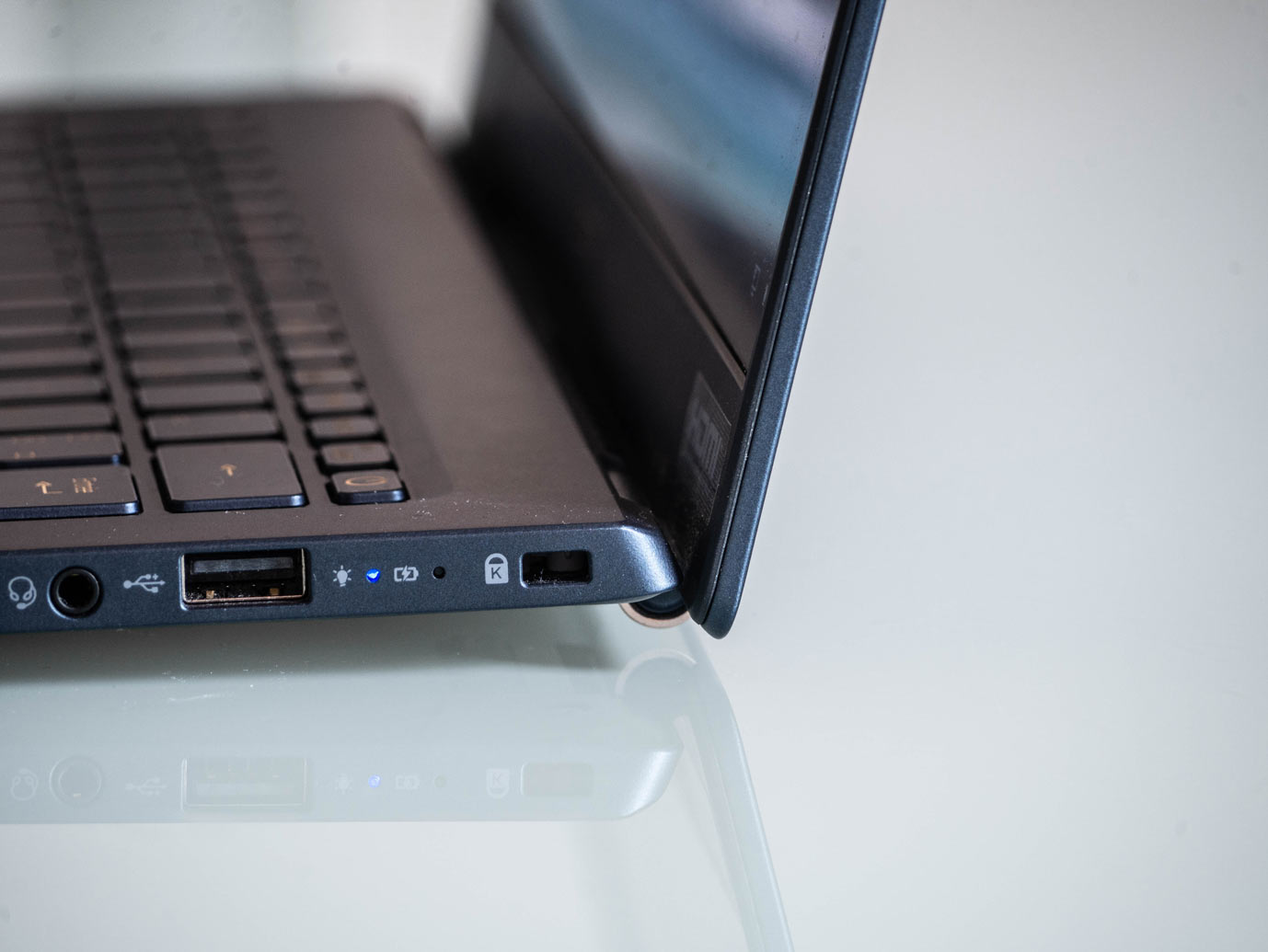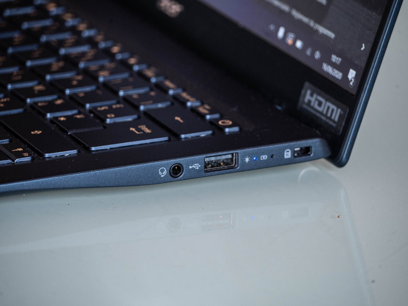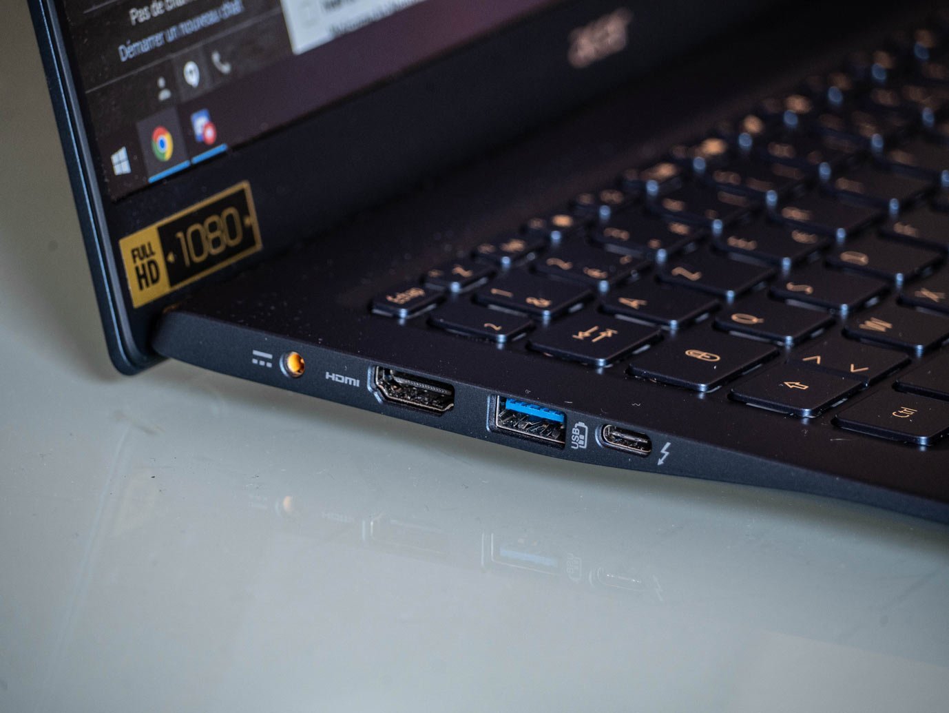 Là où le Swift 7 était assez contraint par ses mensurations et n’embarquait que très peu de connectiques, son petit frère se permet quelques extras pour plus de polyvalence. On a donc un port USB 2.0 (on n’a pas trop compris non plus), un USB 3.0, un USB-C, un port HDMI et un port Jack 3.5mm. On voit pas trop pourquoi cet USB 2.0 n’est pas un USB-C, mais passons.