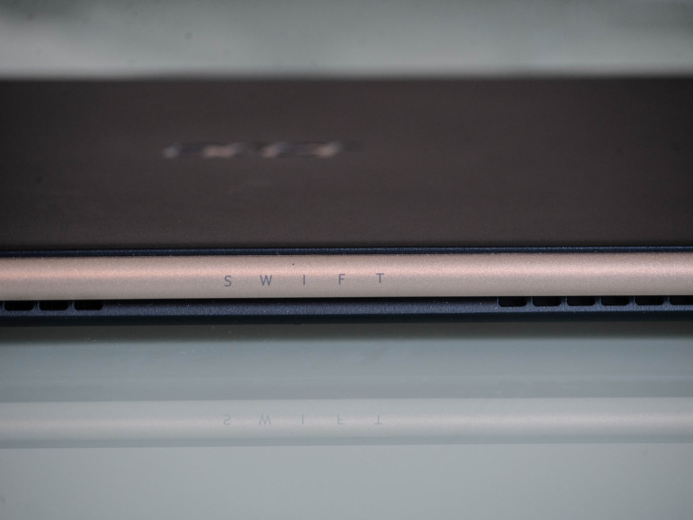 Le Swift 5 lui, arbore un design assez similaire à son grand frère : très fin, bords d’écran fins, gabarit plus étroit à sa base pour une meilleure prise en main. Evidemment son prix ne permet pas de retrouver un châssis métallique mais bien plastique et c’est l’un des premiers soucis. Il est beaucoup moins rigide que le Swift 7 qui était pourtant plus fin, il arrive donc parfois en le prenant de faire crier le ventilateur en le pressant par mégarde. Même en y faisant attention, cela arrive relativement souvent et c’est assez dérangeant pour la durée de vie du produit.