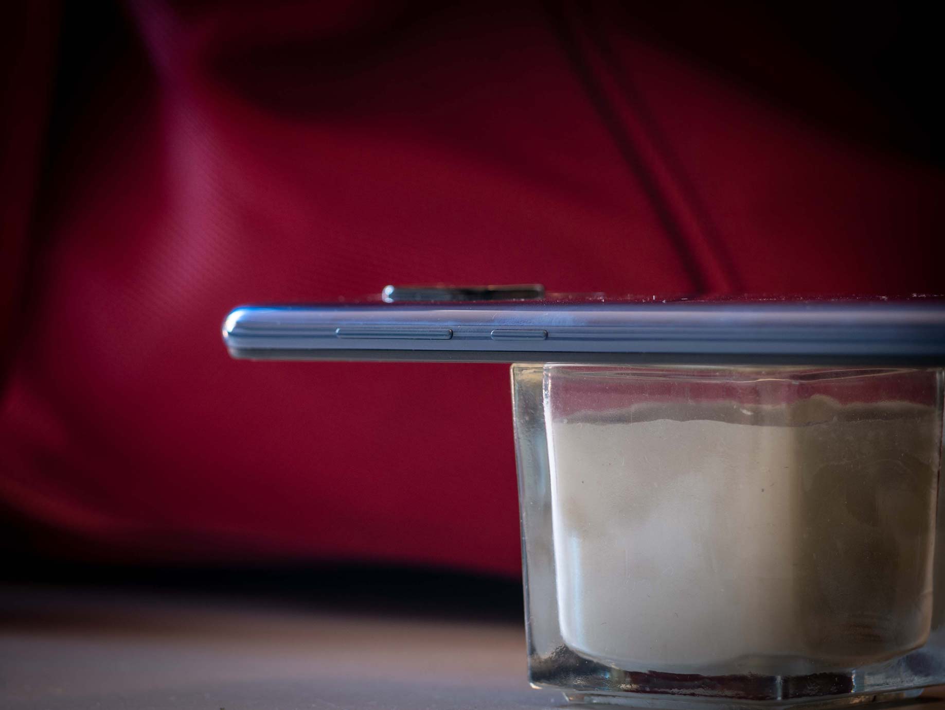 Le gabarit est très raisonnable malgré son gigantesque écran de 6.5 pouces (certifié Corning Gorilla Glass 5 pour le protéger des rayures) : 162,3 x 77,2 x 8,9 mm. Avec son écran borderless, on n’a pas l’impression d’avoir un smartphone gigantesque en main (et c’est pourtant bien le cas). Il est plutôt épais à cause de sa batterie très importante mais ses bords arrondis lui assurent quand même une prise en main très abordable. On gagne en hauteur des écrans avec cet appareil photo frontal intégré à l’écran, il faut du temps pour s’y habituer mais on parvient rapidement à l’oublier. Le choix de reporter ce capteur sous l’écran supprime l’habituel barre supérieure et vient donc casser la symétrie habituelle sur la face d’un smartphone.