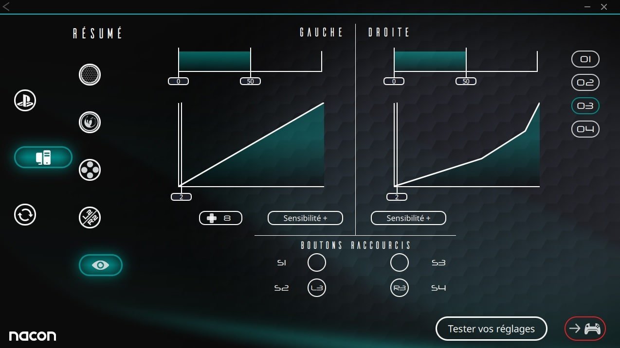 Pour chacun de ces profils, vous aurez la possibilité d’entièrement remapper votre manette, de modifier la courbe de réponse et la zone morte des joysticks, configurer la réactivité des gâchettes L2 et R2, voire même régler le rétroéclairage autour du joystick droit. Vous pourrez également assigner des touches aux quatre boutons de raccourcis situés à l’arrière de la manette (même si ce dernier point est très facilement et rapidement paramétrable en plein jeu même sans être connecté à un PC). Si certains détails les plus techniques de ces paramétrages étaient au départ quelque peu obscurs pour moi, Nacon a eu la très bonne idée de créer plusieurs vidéos d’explication sur le sujet sur leur page YouTube.