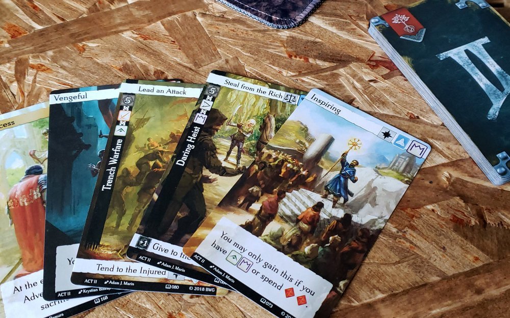 Remporter une épreuve permet de la placer sous la carte Personnage de l’acte en cours, tandis qu’échouer la défausse et nous octroie un point d’expérience. Cela vous paraît une conséquence étonnamment peu punitive ? Comme vous le verrez, perdre une occasion de prendre une carte est une punition en soi, que vous pourriez payer très cher à la fin de la partie si vos adversaires réussissent toutes leurs épreuves ou se contentent de traits de personnalité, et finissent donc avec plus de cartes que vous…