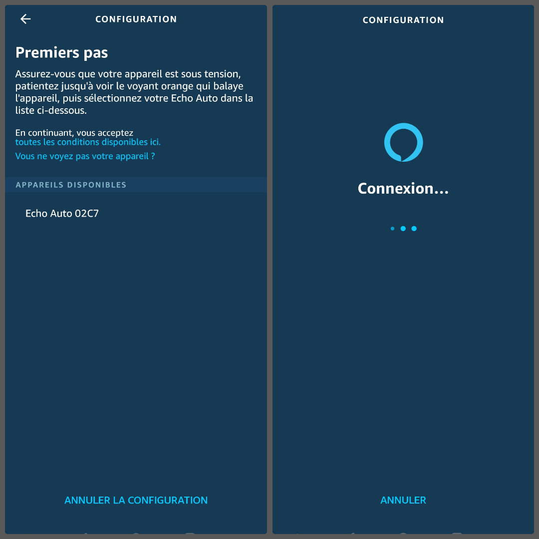 Une fois l’installation « hardware » de faite, qui a dû me prendre en tout et pour tout 2 minutes, place à la configuration à l’aide bien évidemment de l’application Alexa, indispensable pour faire fonctionner Echo Auto. Activez le Bluetooth et laissez-vous guider. Tout est bien expliqué et tout vous sera détaillé étape par étape. Une fois le Bluetooth mis en route sur votre smartphone, ce dernier va repérer Echo Auto et quelques tests son vous aideront à être sûr que la configuration soit faite. Je n’ai rencontré aucun problème et cela a dû me prendre 5 petites minutes avant que tout soit opérationnel.
