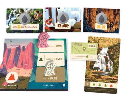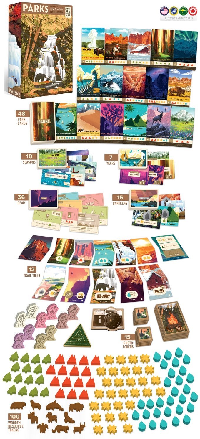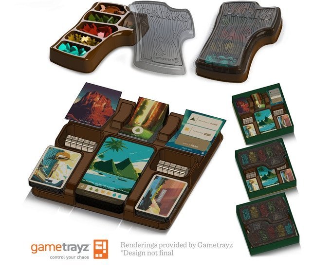 Cet engouement exceptionnel, il suffit de jeter un œil à la page de la campagne pour le comprendre : des illustrations uniques sublimes du collectif d’artistes Fifty-Nine Parks, qui mettent à l’honneur les parcs nationaux états-uniens (et donnent en effet envie de les visiter tous) tout en leur reversant une partie des recettes, un thermoformage de Game Trayz (Wingspan, La Forêt des frères Grimm, Tang Garden…) particulièrement joli et pratique, l’un des meilleurs que je connaisse, tout cela pour un jeu familial (à partir de 8/10 ans) apparemment assez riche si l’on en juge par la variété du matériel…