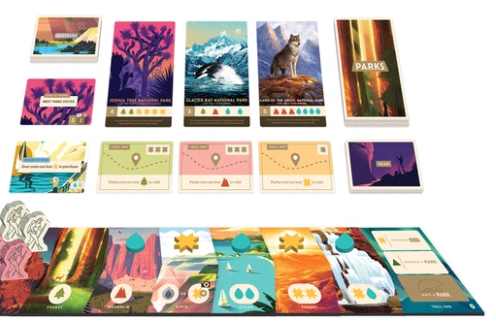 Or Parks le jeu est, comme Parks l’objet, un poétique appel à la contemplation, proche de la philosophie d’un Tokaido : on essaye d’y collecter des ressources naturelles afin de visiter les plus beaux parcs dans une « course » en binôme où savoir astucieusement jouir des plus beaux paysages nous sera plus bénéfique que de nous précipiter vers la fin, et où tous les éléments relevant du « matériel » (équipement, ressources) ne sont qu’une assistance au spirituel sans rien rapporter par eux-mêmes en fin de partie.