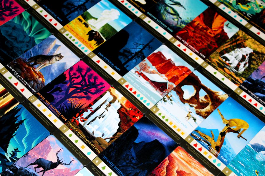 Parks est avant tout une merveilleuse invitation au voyage. Ses illustrations des parcs nationaux états-uniens, réalisées par un collectif d’artistes manifestement très talentueux, sont de véritables cartes postales (et certaines sont de fait vendues comme cartes postales), et se contenter de ne leur accorder pour tout texte que leur nom, l’État dans lequel ils se trouvent et deux courtes lignes décrivant leur spécificité témoigne assez d’un désir sincère de partager dans un jeu superbe une réalité superbe.