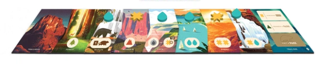 Sur le plateau, inutile mais aidant à la mise en place en plus de rappeler les règles, une pile de dix cartes Saison, dont la première indique des ressources à poser sur certaines tuiles Sentier, annonçant la météo sous laquelle s’organisera notre randonnée (plus de gouttes d’eau en cas de pluie, de soleil s’il fait sec…).