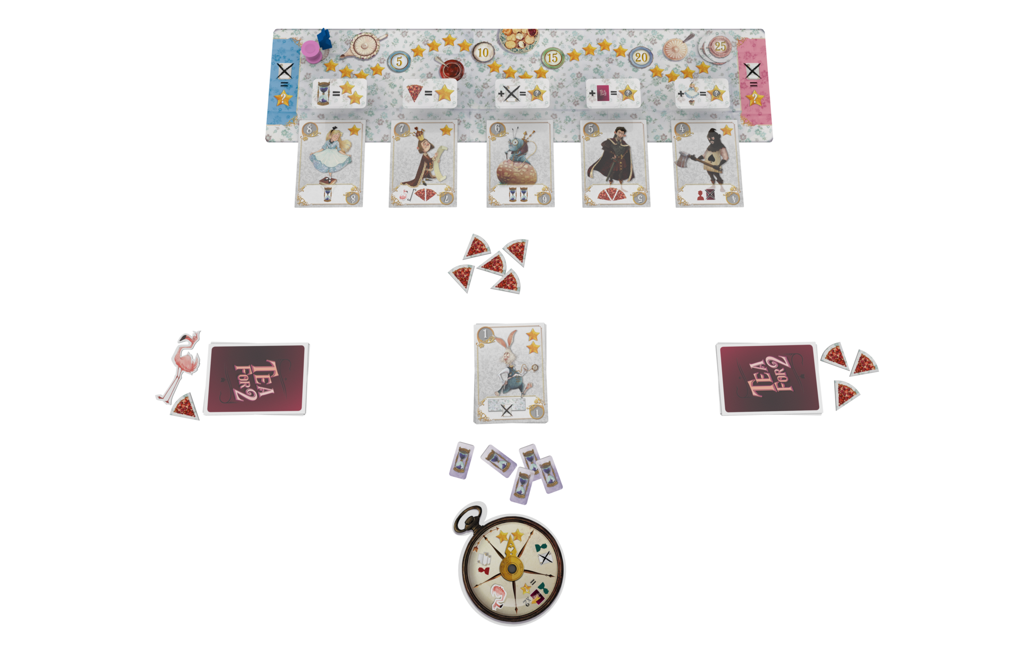 Tea for 2 se joue avec un plateau, comportant une piste de score sur la première case de laquelle les joueurs posent leur pion (un lapin bleu ou un chapeau rose). Les deux extrémités en sont destinées à accueillir les cartes détruites de chacun et seront donc orientées vers le bon joueur.